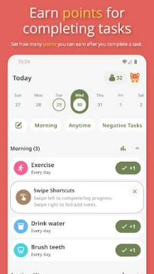 It's easy to create and schedule new habits to fit seamlessly into your daily routine! This app is your ultimate tool for staying organized and focused on your goals, whether it's to drink more water, exercise regularly, or practice mindfulness. The best part is that you can assign points to these tasks, and each time you complete one, you earn the corresponding points!