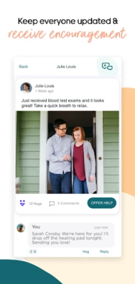 The first layer of support is rallying personal social circles (friends, family, coworkers, neighbors) to help with practical needs (meals, rides, respite care, child care, pet care, house errands). Keep everyone updated in a private feed where your community can send you a ‘hug’ and provide emotional support throughout the journey.